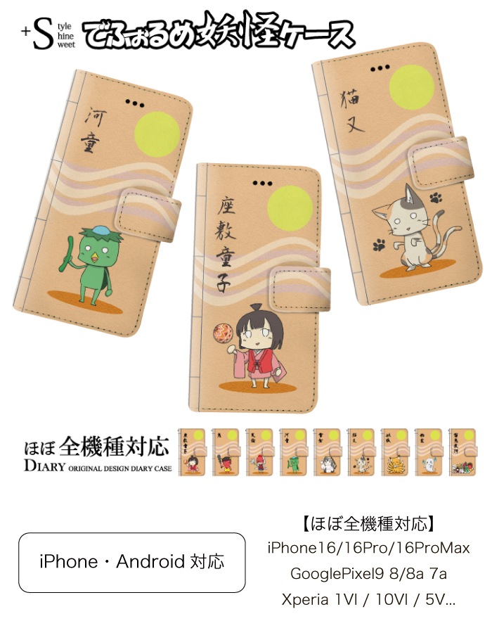 愉快な妖怪たち 手帳型ケース 多機種対応 昔話 おばけ 座敷童子 猫又 妖狐