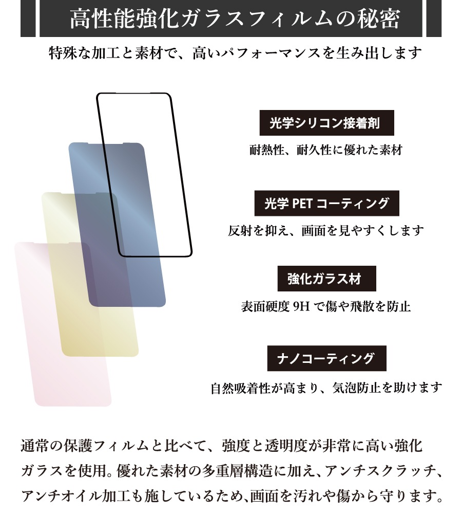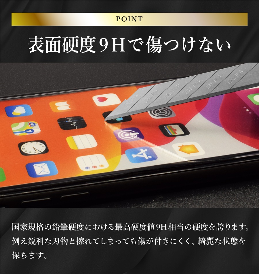 傷がつきにくい表面硬度9Hで画面をしっかり守ります。