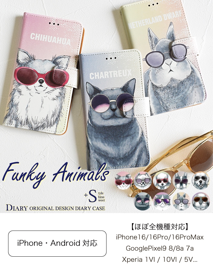 ファンキー動物 手帳型ケース 多機種対応 アニマル 動物 犬 ねこ うさぎ サングラス