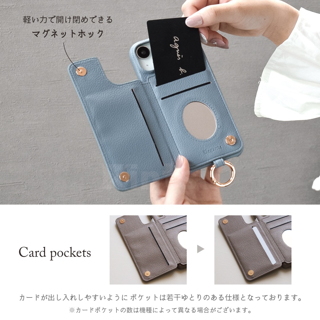 蓋を開けるとカードポケットとミラー付きで機能性にもこだわりました。