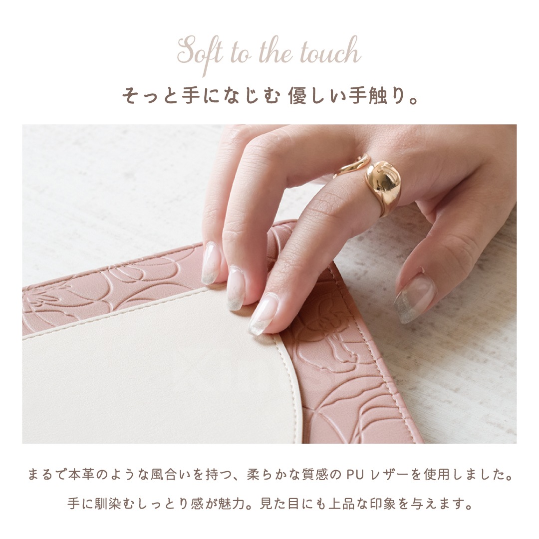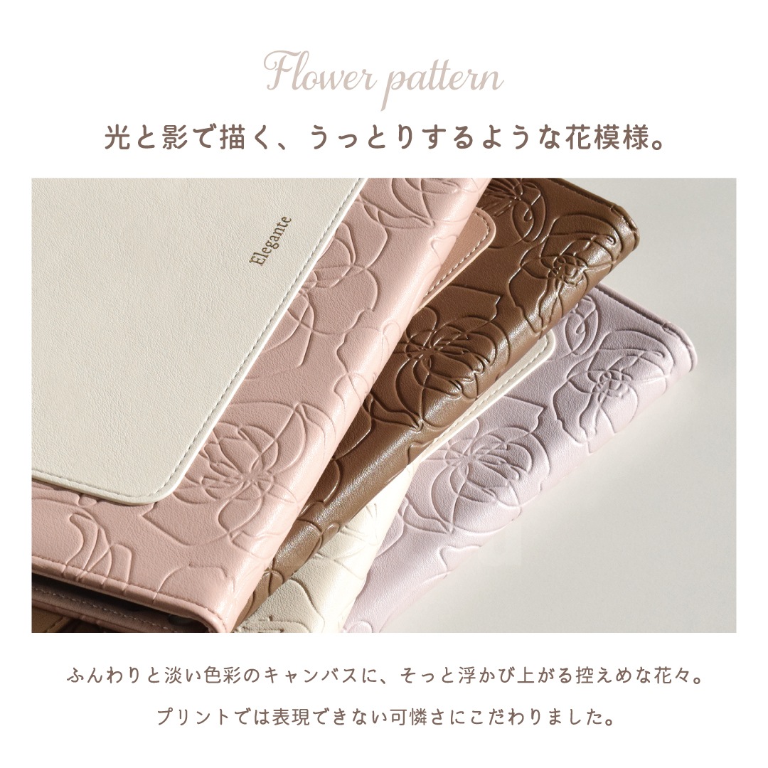 上品な花柄のデボス加工が大人可愛いデザイン。