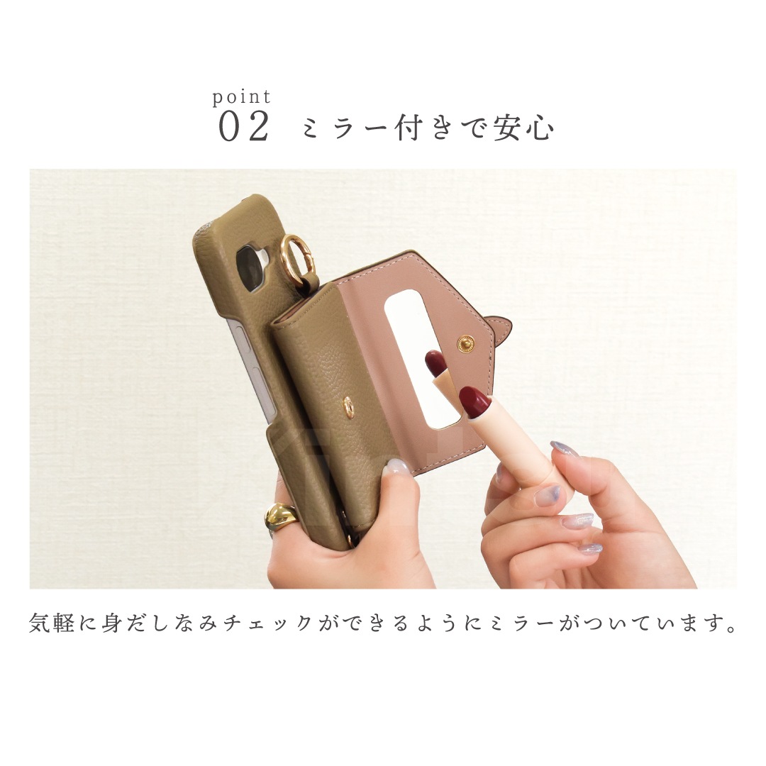 小さなミラー付きだから、ふとした瞬間の身だしなみチェックもさりげなく叶います。