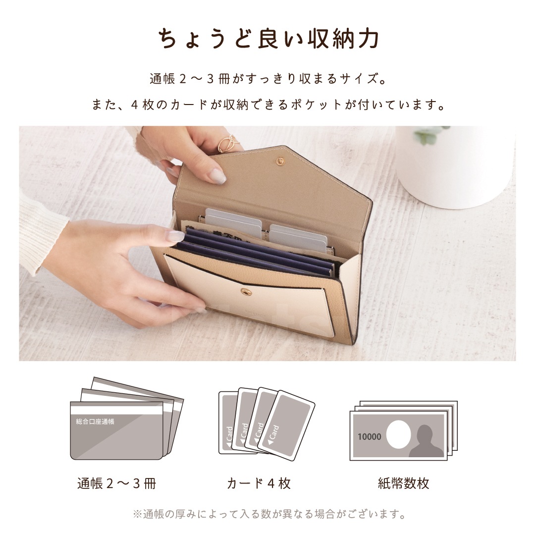 約1cmほどのスリムなケースに銀行通帳などが2~3冊入ります。